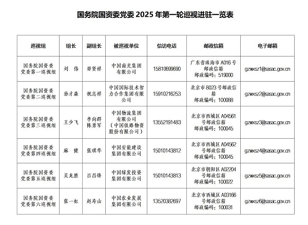 按照國務院國資委黨委和巡視工作領導小組部署安排,截至2025年5月20日,國務院國資委黨委2025年第一輪巡視完成進駐工作。國務院國資委黨委6個巡視組將對中國國際技術智力合作集團有限公司、中國農業發展集團有限公司、中國安能建設集團有限公司、中國南光集團有限公司、中國物流集團有限公司、中國綠發投資集團有限公司等6家企業黨委開展常規巡視,對中國物流集團有限公司所屬中國鐵路物資股份有限公司黨委開展提級巡視。