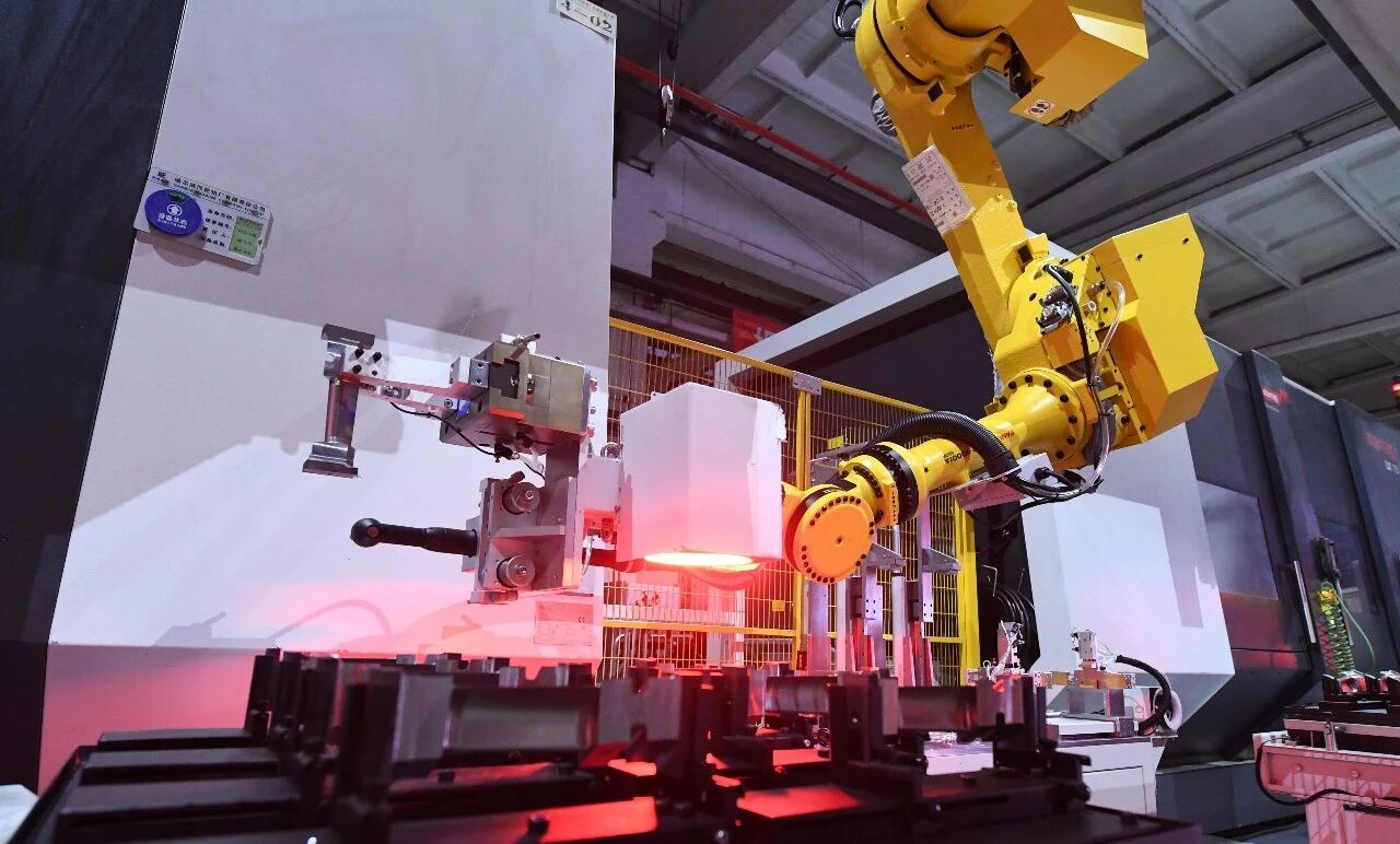汽輪機(jī)公司中小葉片自動加工產(chǎn)線機(jī)械手臂正在裝卡葉片。